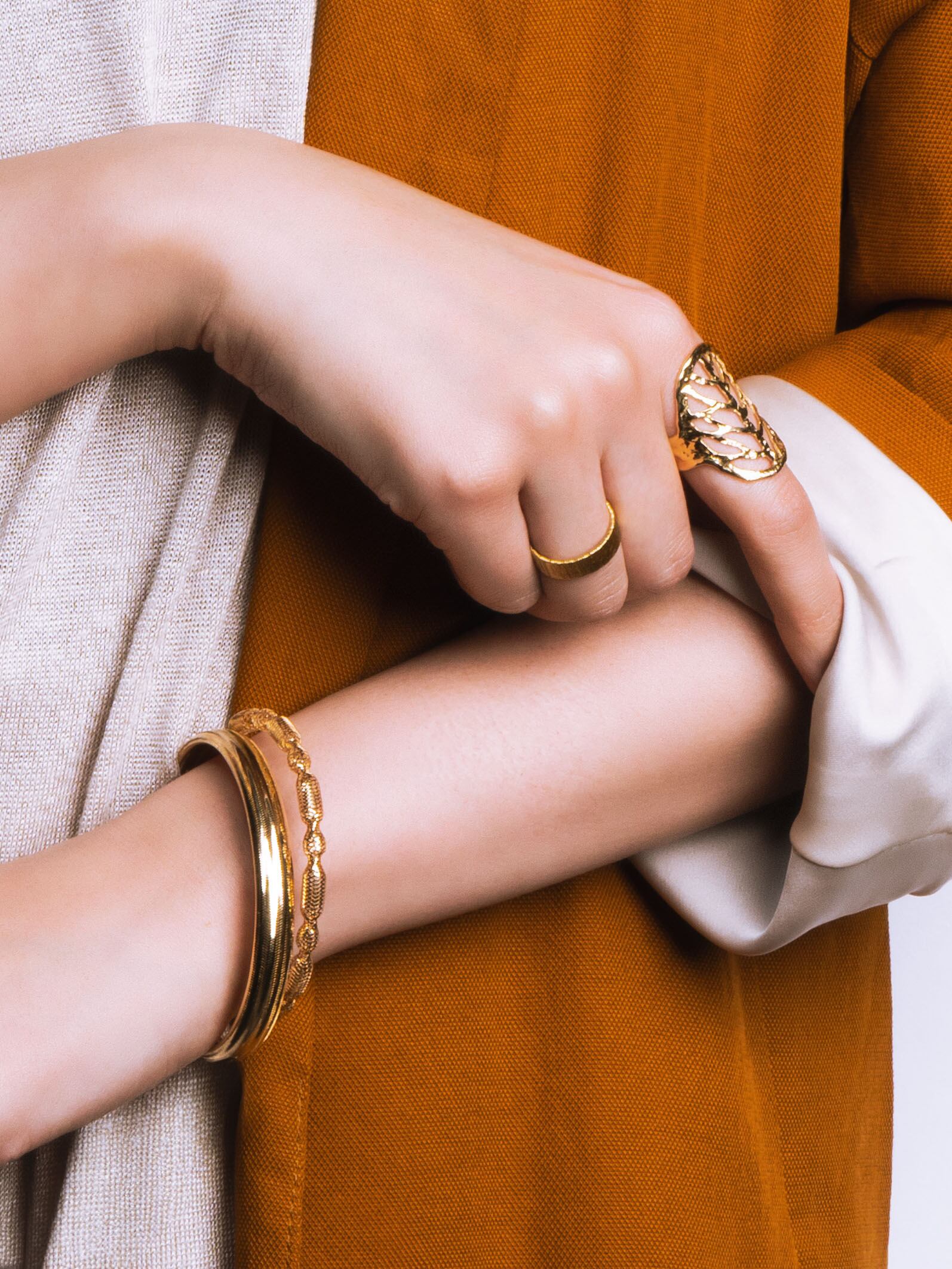 繊細に編み込まれたK18イエローゴールドが、手首にそっと沿い、光をやわらかく反射します。