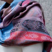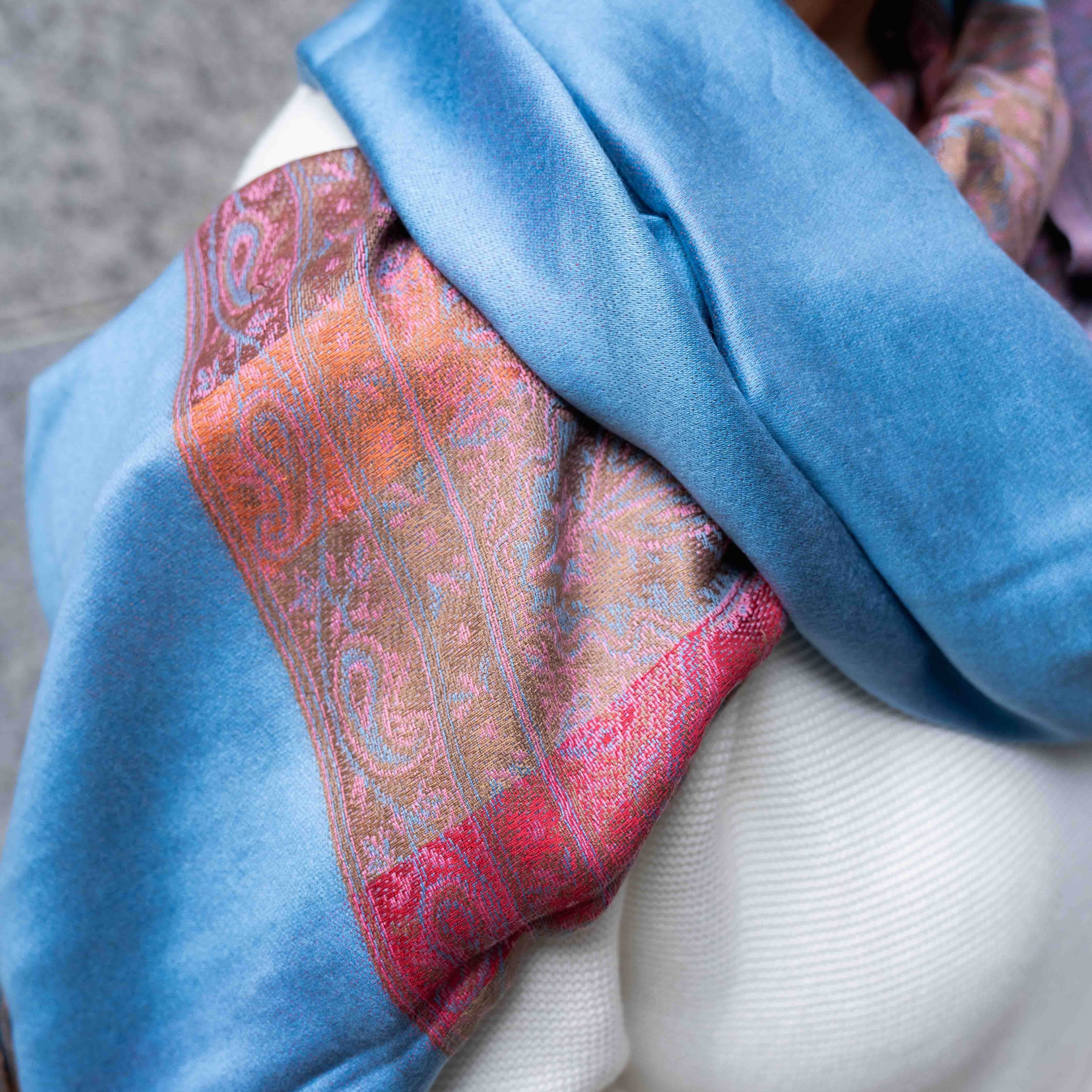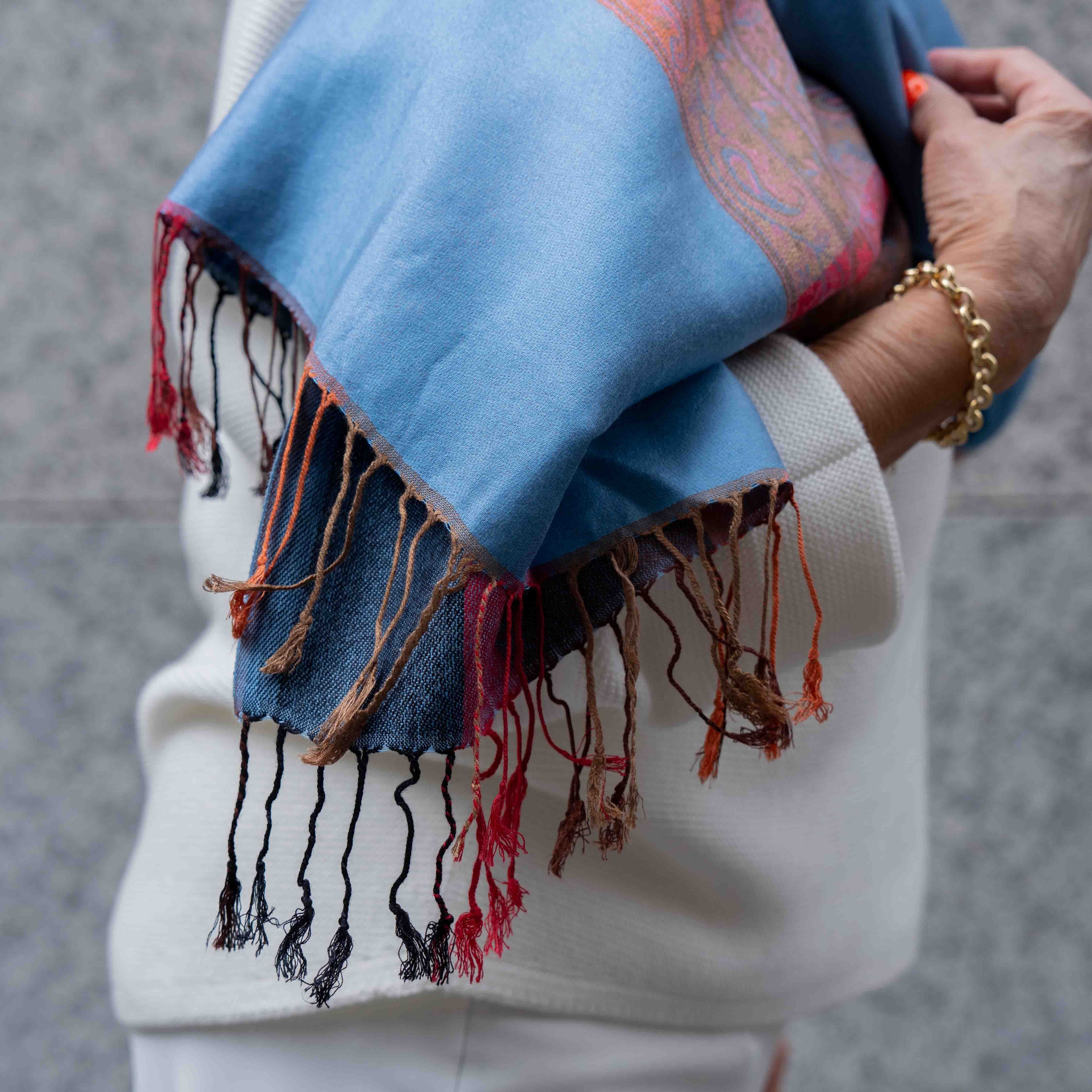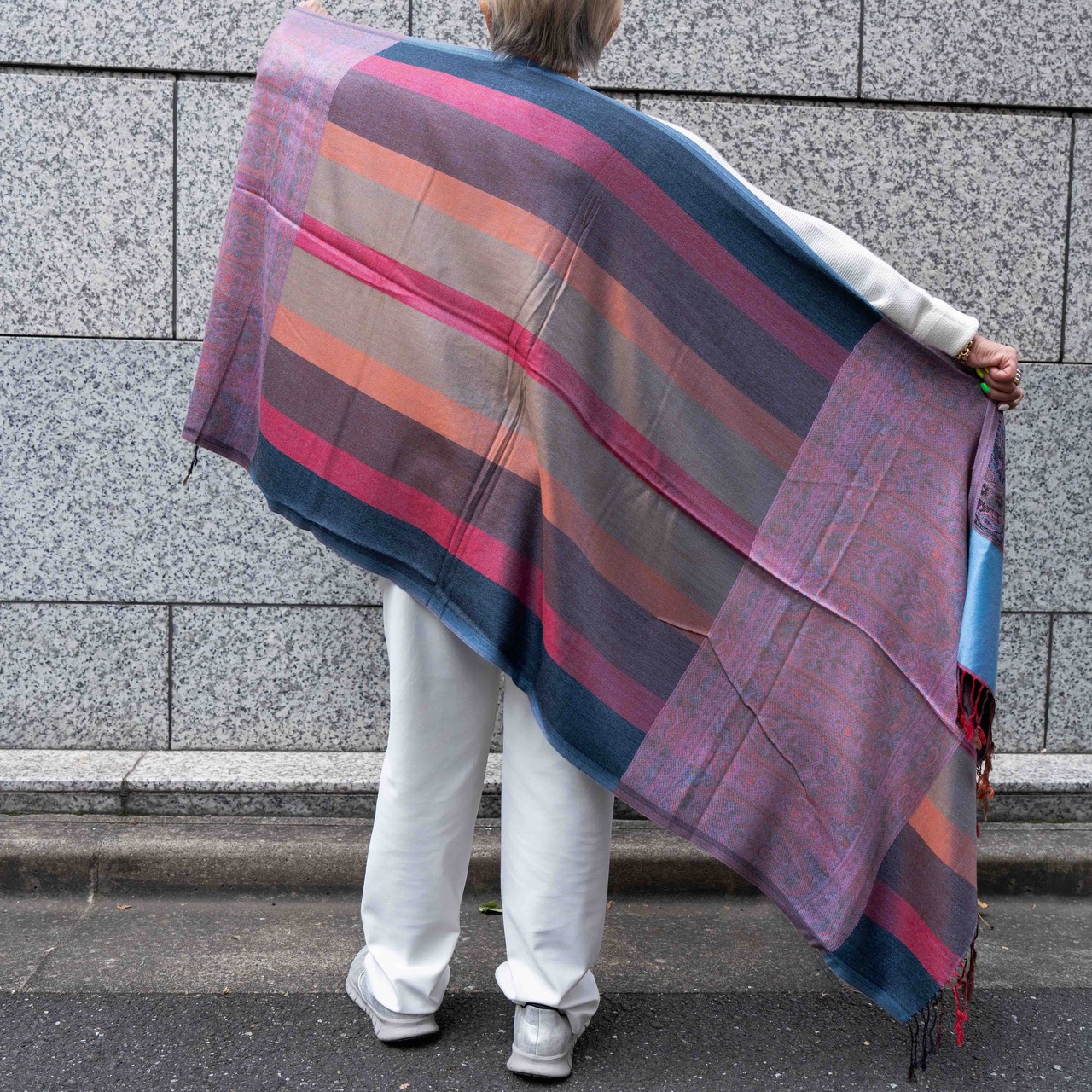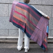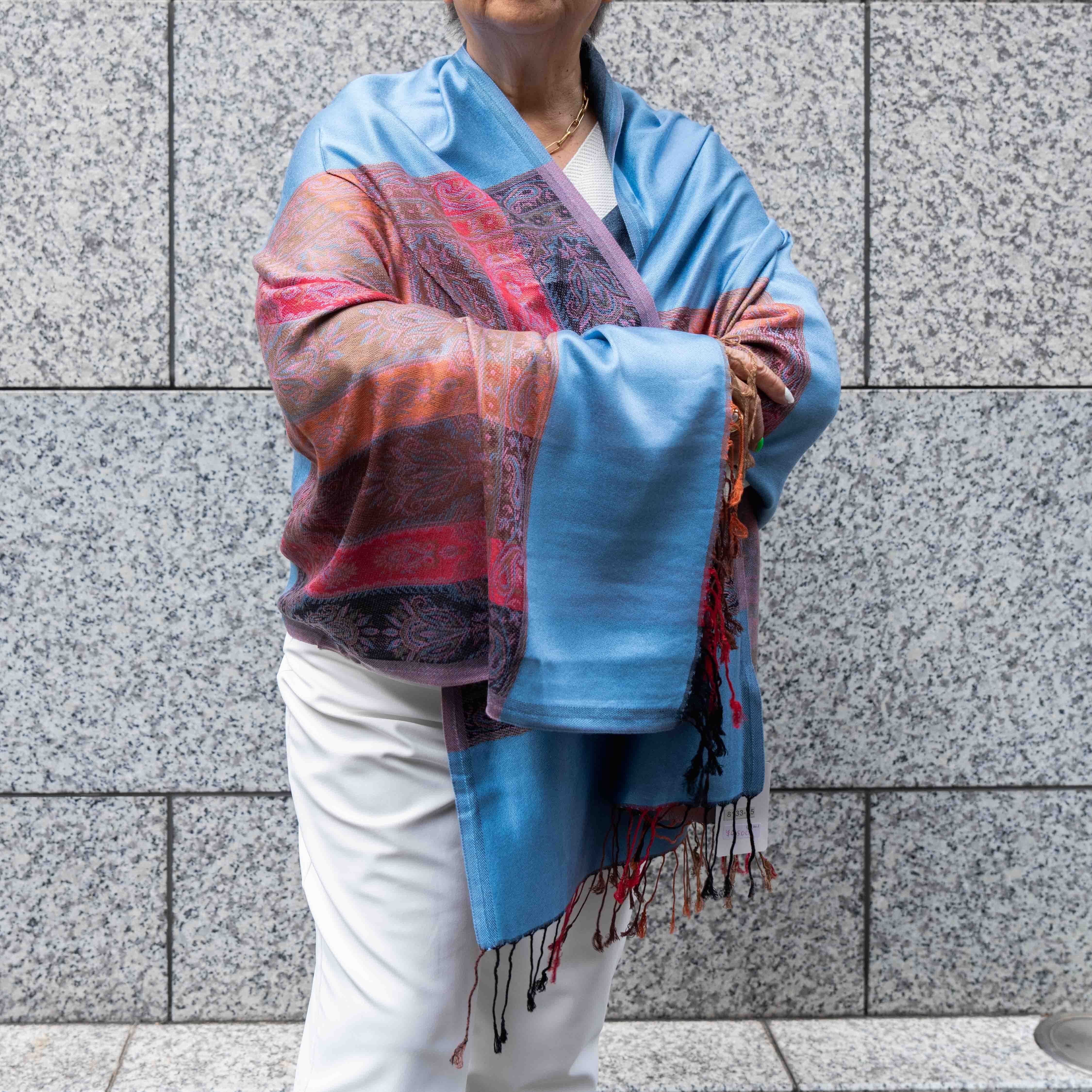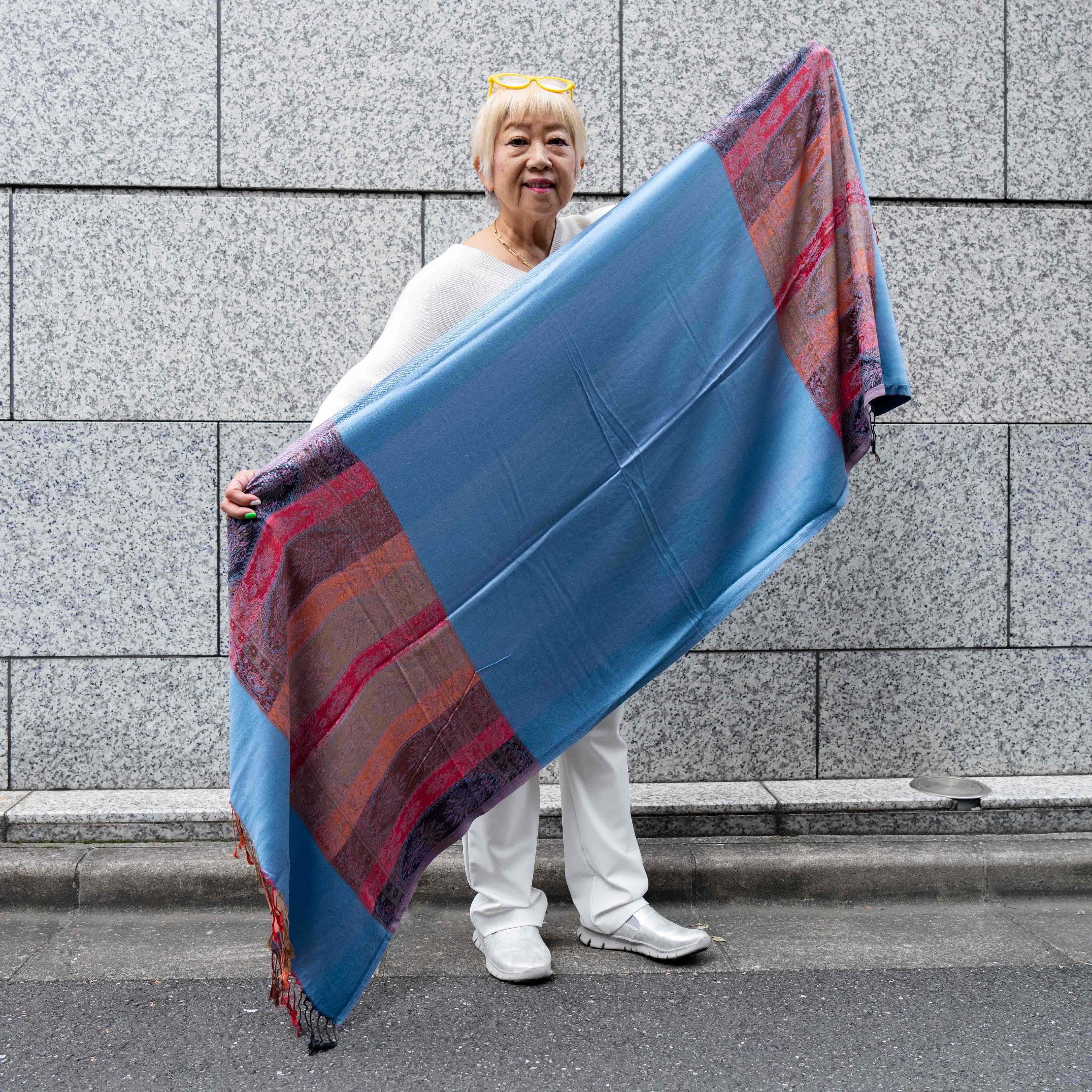 鮮やかなブルーをベースに、レッド・パープル・ブラウンなどの多色を組み合わせたマルチカラーストールです。両面とも美しく、リバーシブルのように巻き方で表情が変わるのも魅力。大判サイズで肩掛けにも巻き物にも使いやすく、装いのアクセントにぴったりの一枚です。