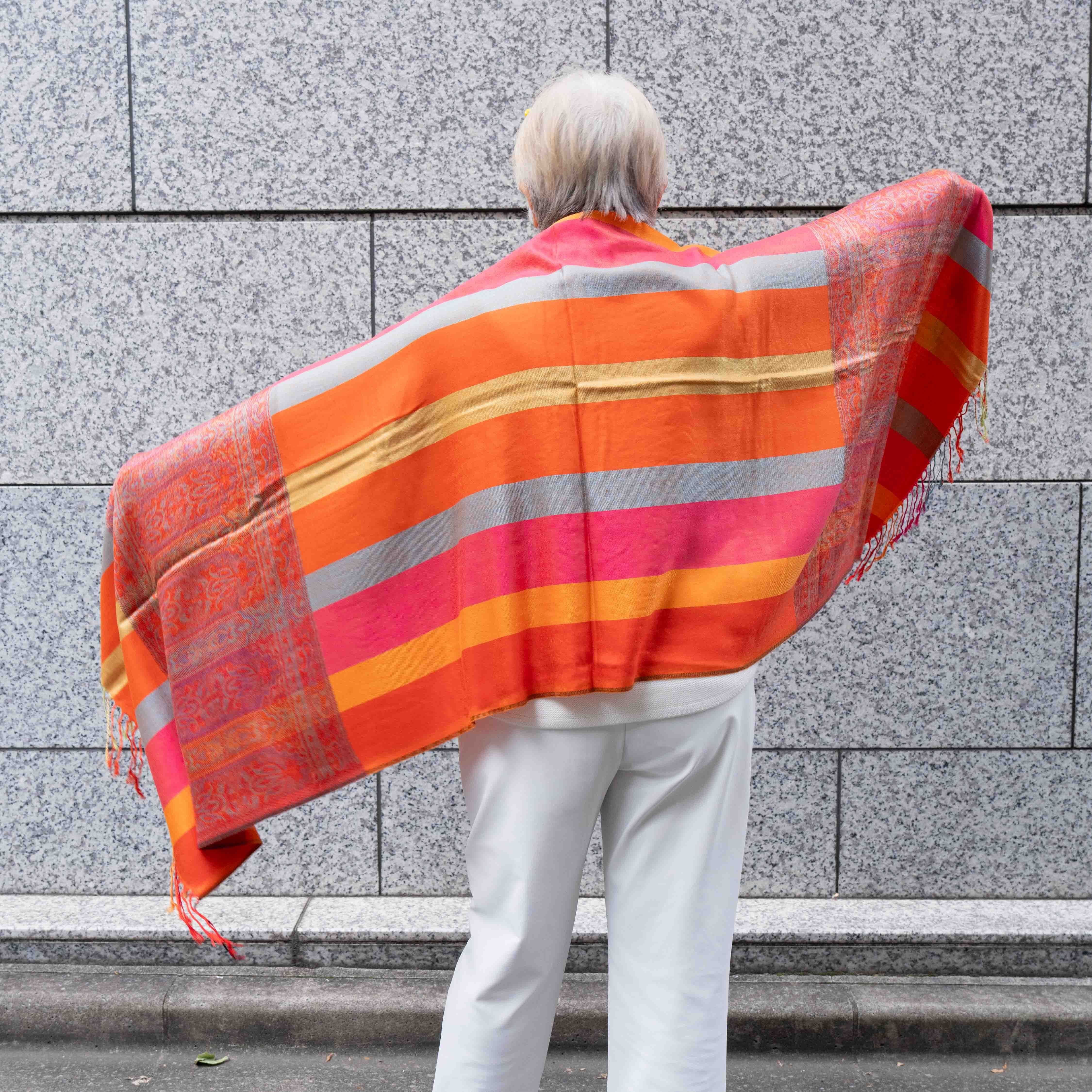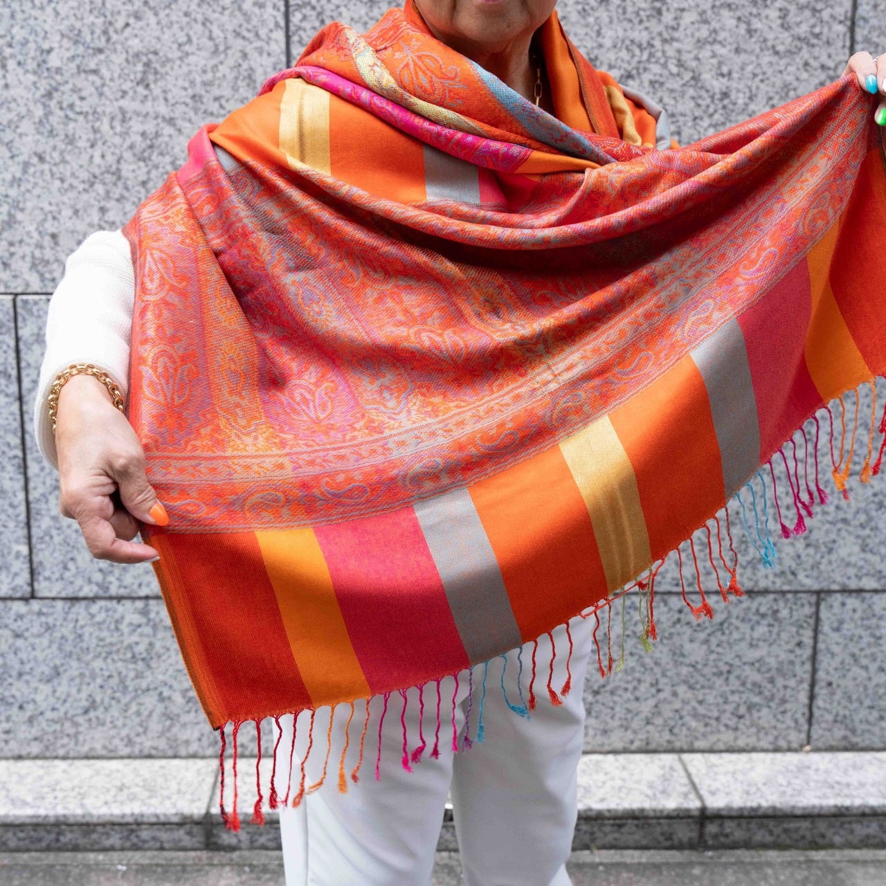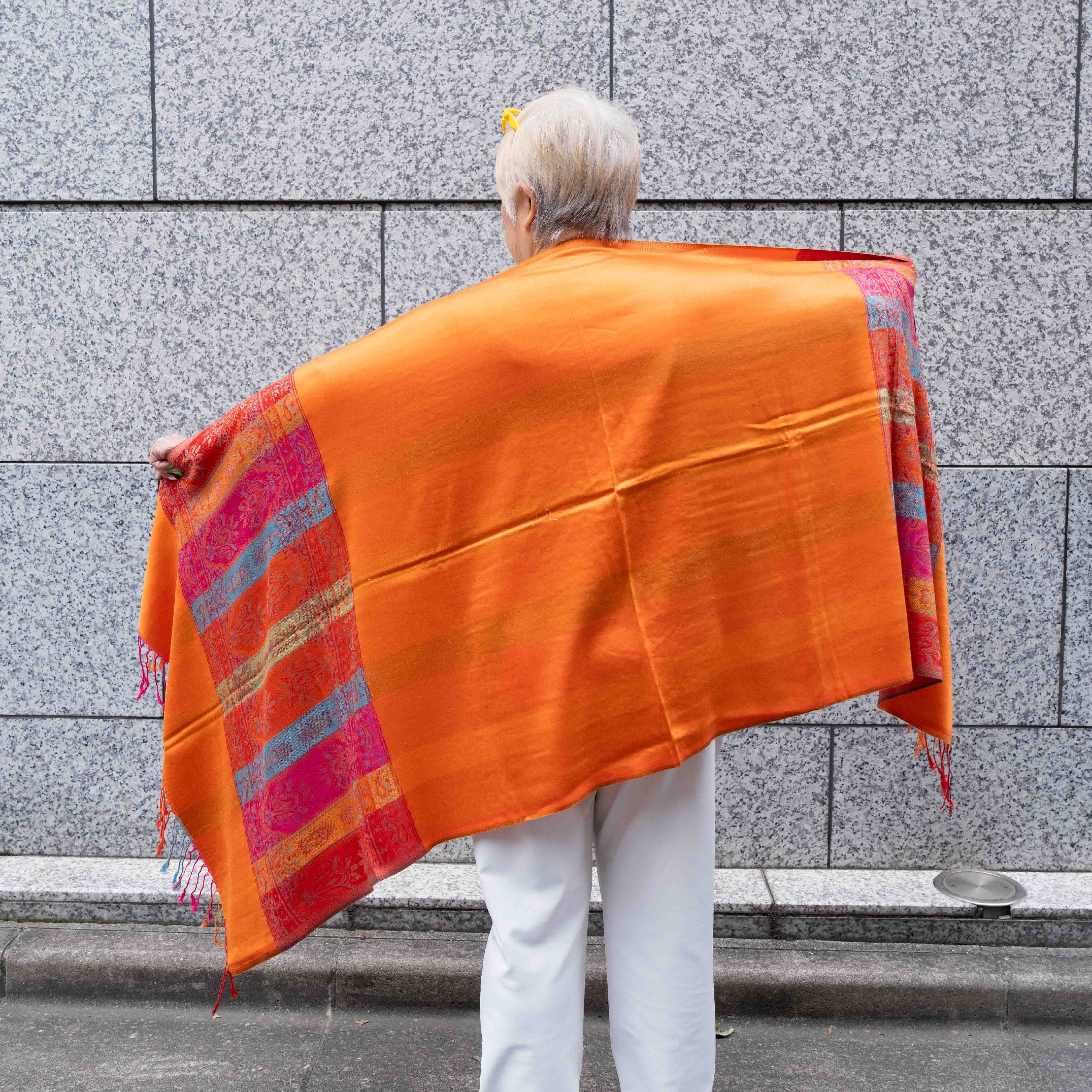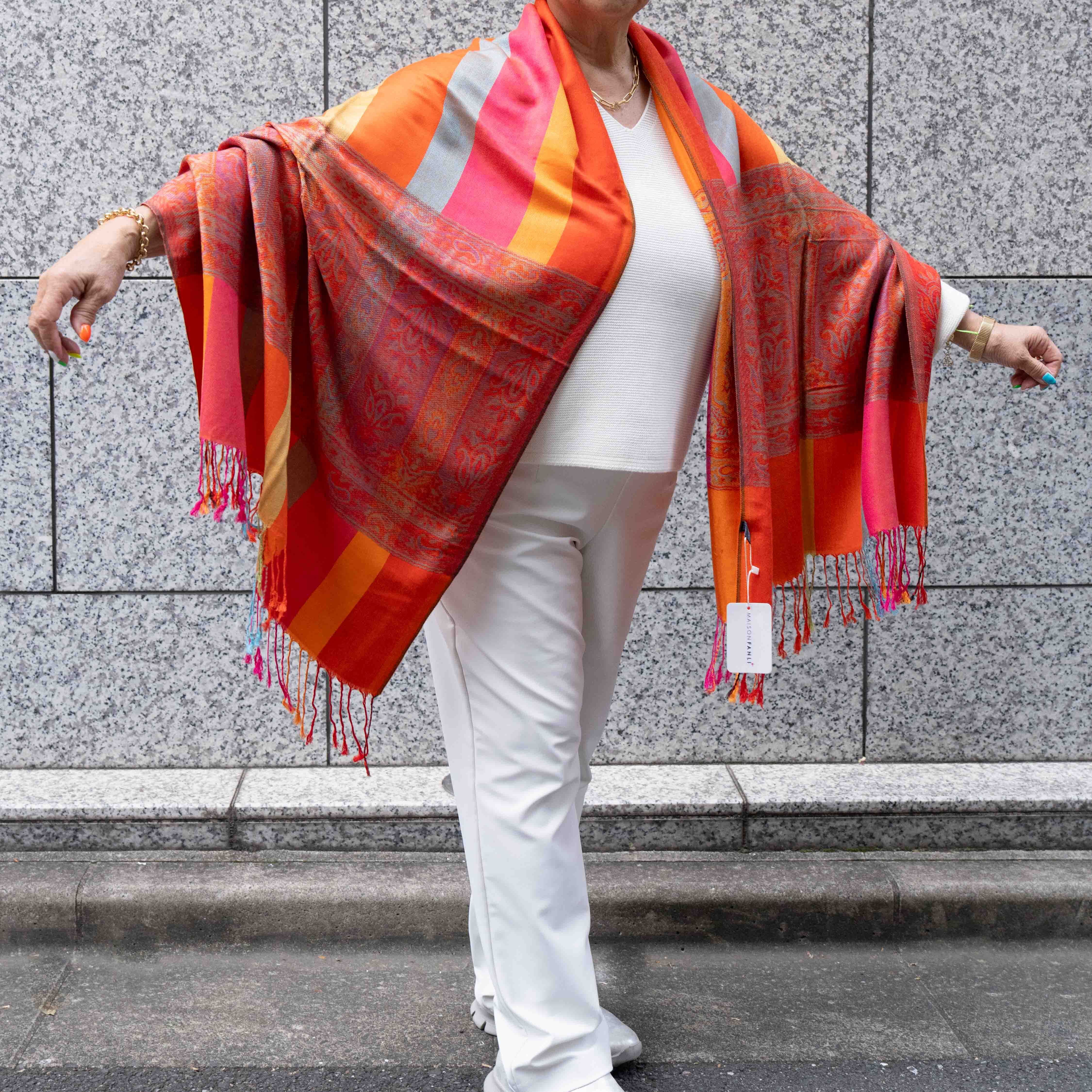 鮮やかなオレンジを基調に、ピンク・ターコイズ・ゴールド・グレーなど多色を組み合わせたマルチカラーストールです。端には繊細なペイズリー柄を織り込み、巻き方によって多彩な表情が生まれる華やかな一枚。大判サイズでショールのように羽織ることもでき、装いのアクセントとして季節を問わず活躍します。
