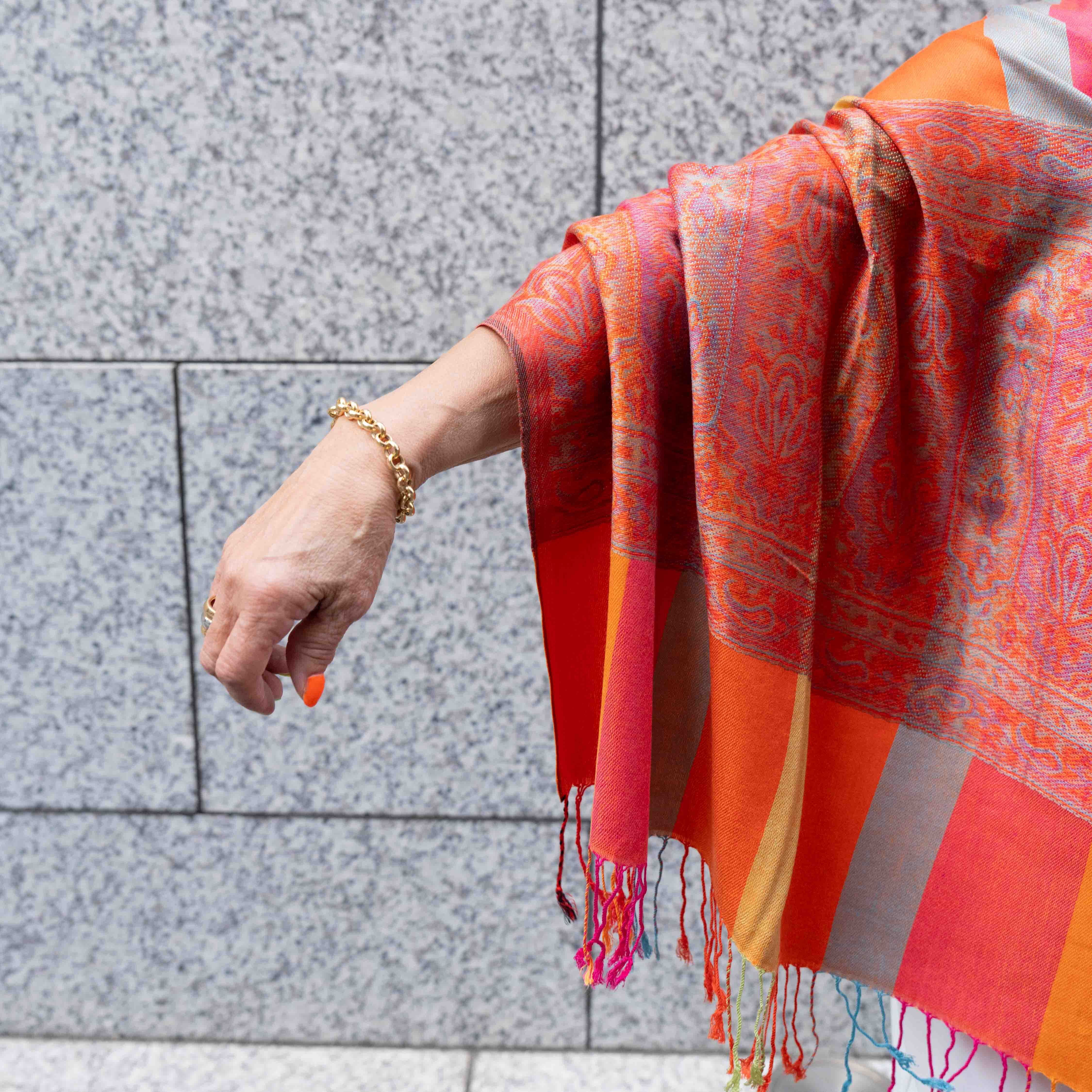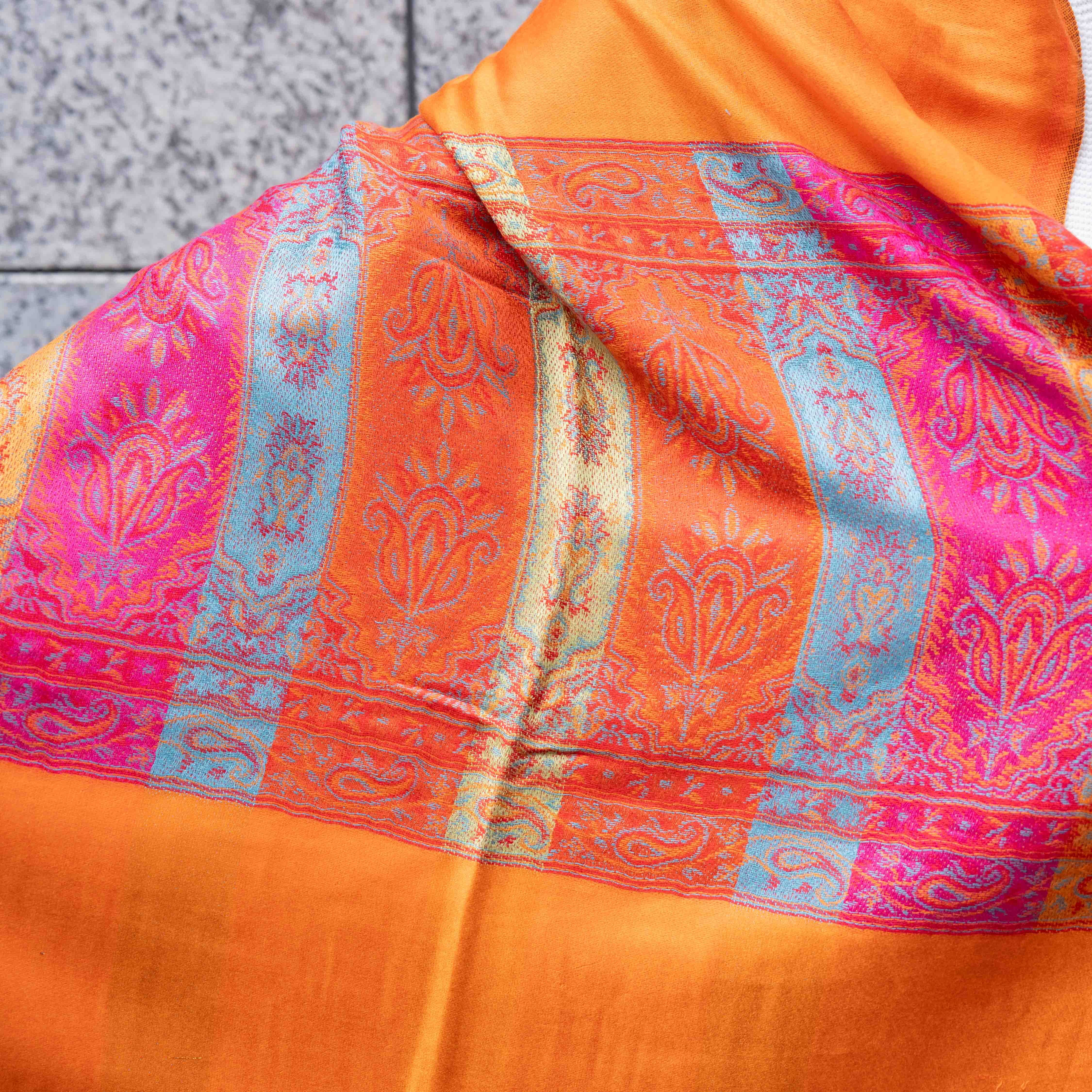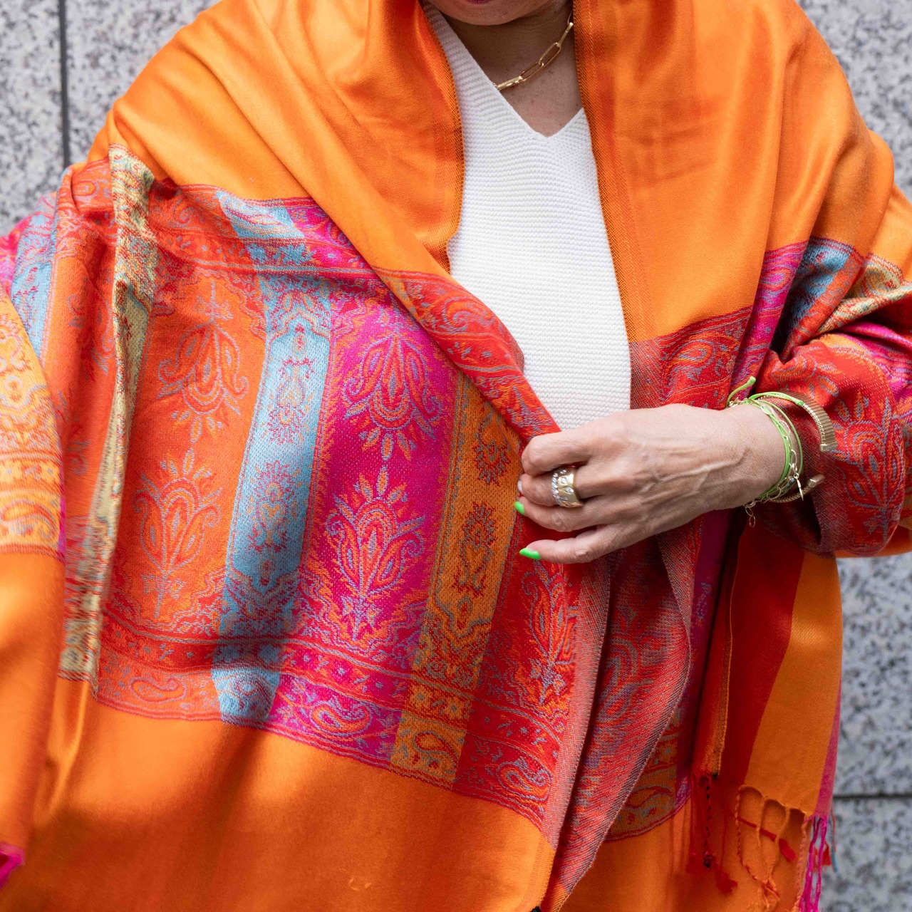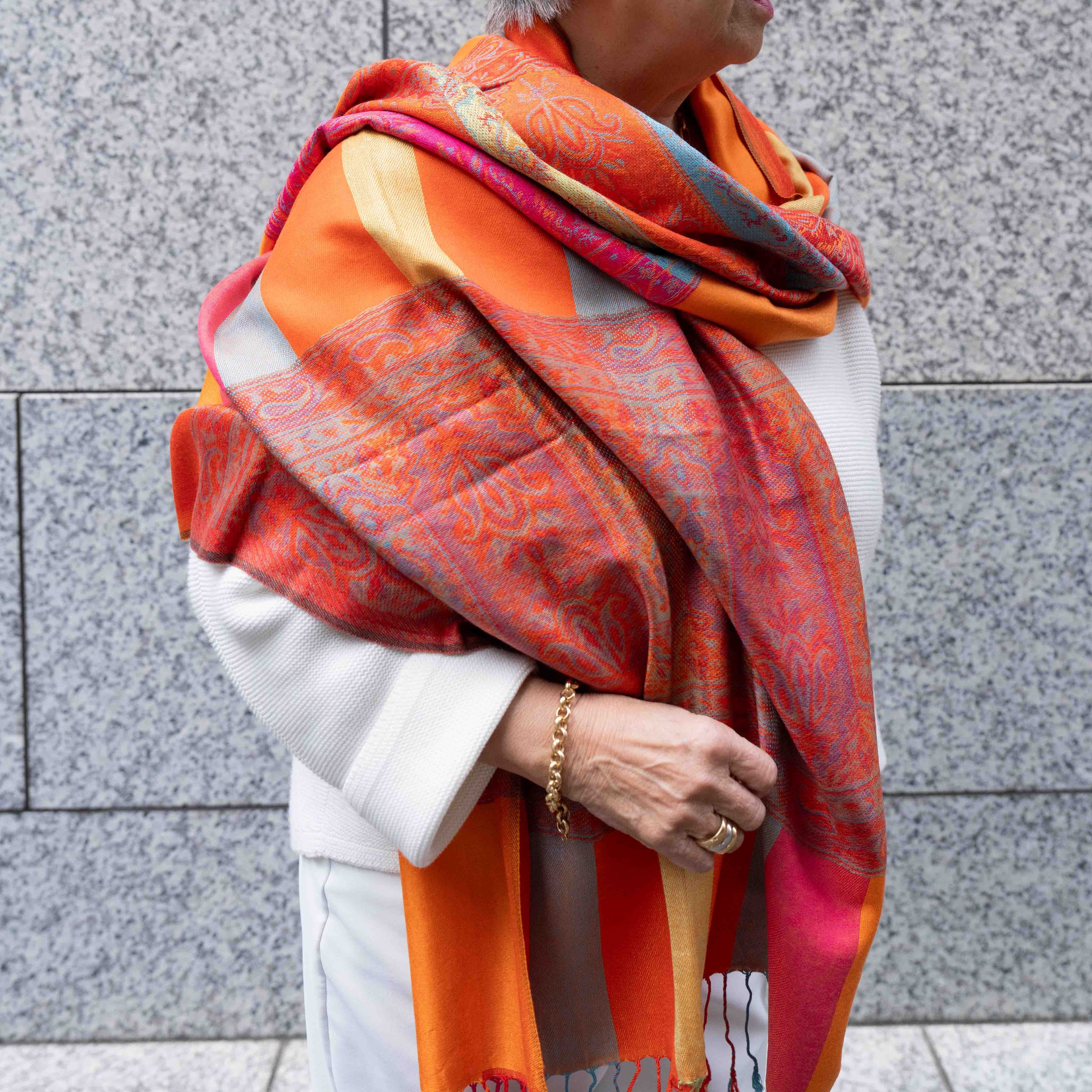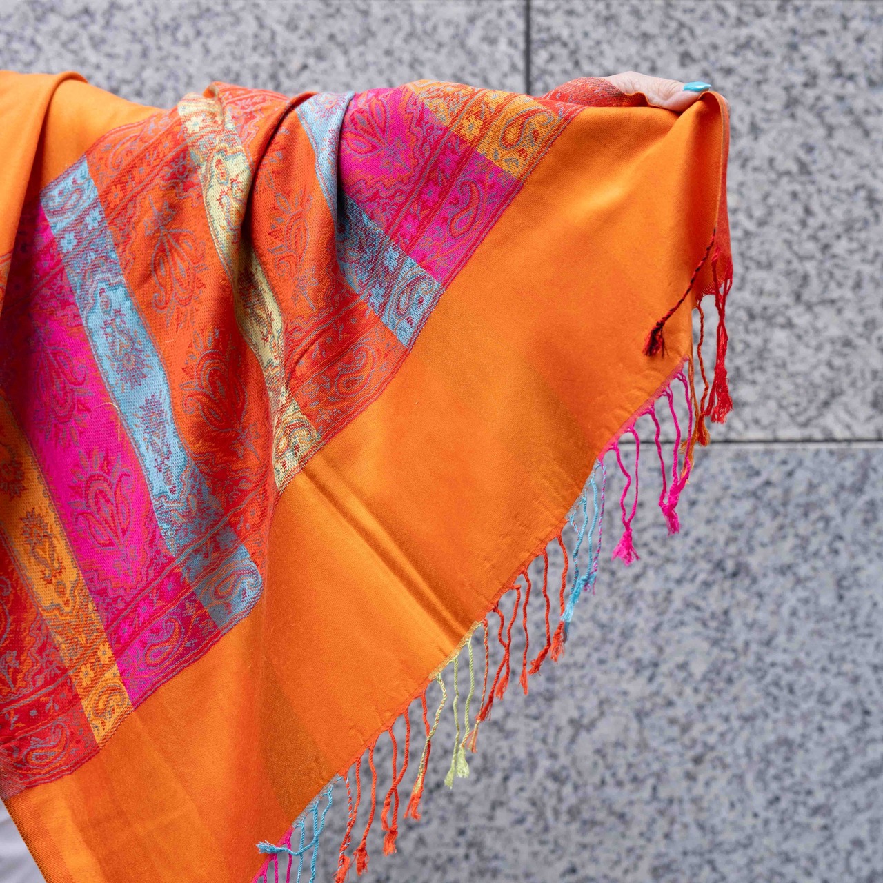 鮮やかなオレンジを基調に、ピンク・ターコイズ・ゴールド・グレーなど多色を組み合わせたマルチカラーストールです。端には繊細なペイズリー柄を織り込み、巻き方によって多彩な表情が生まれる華やかな一枚。大判サイズでショールのように羽織ることもでき、装いのアクセントとして季節を問わず活躍します。