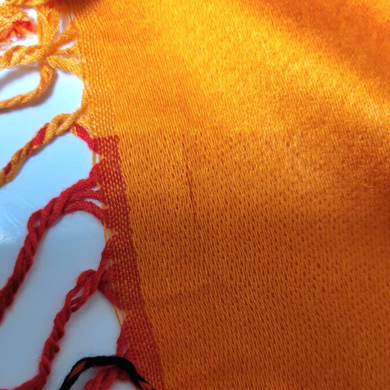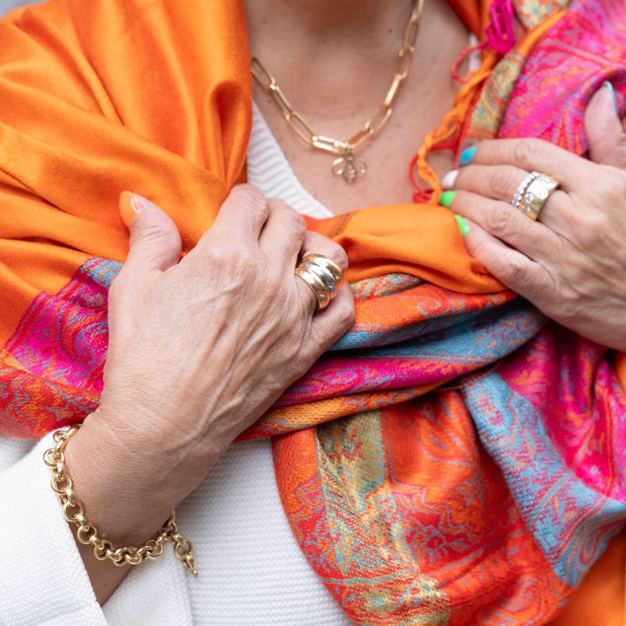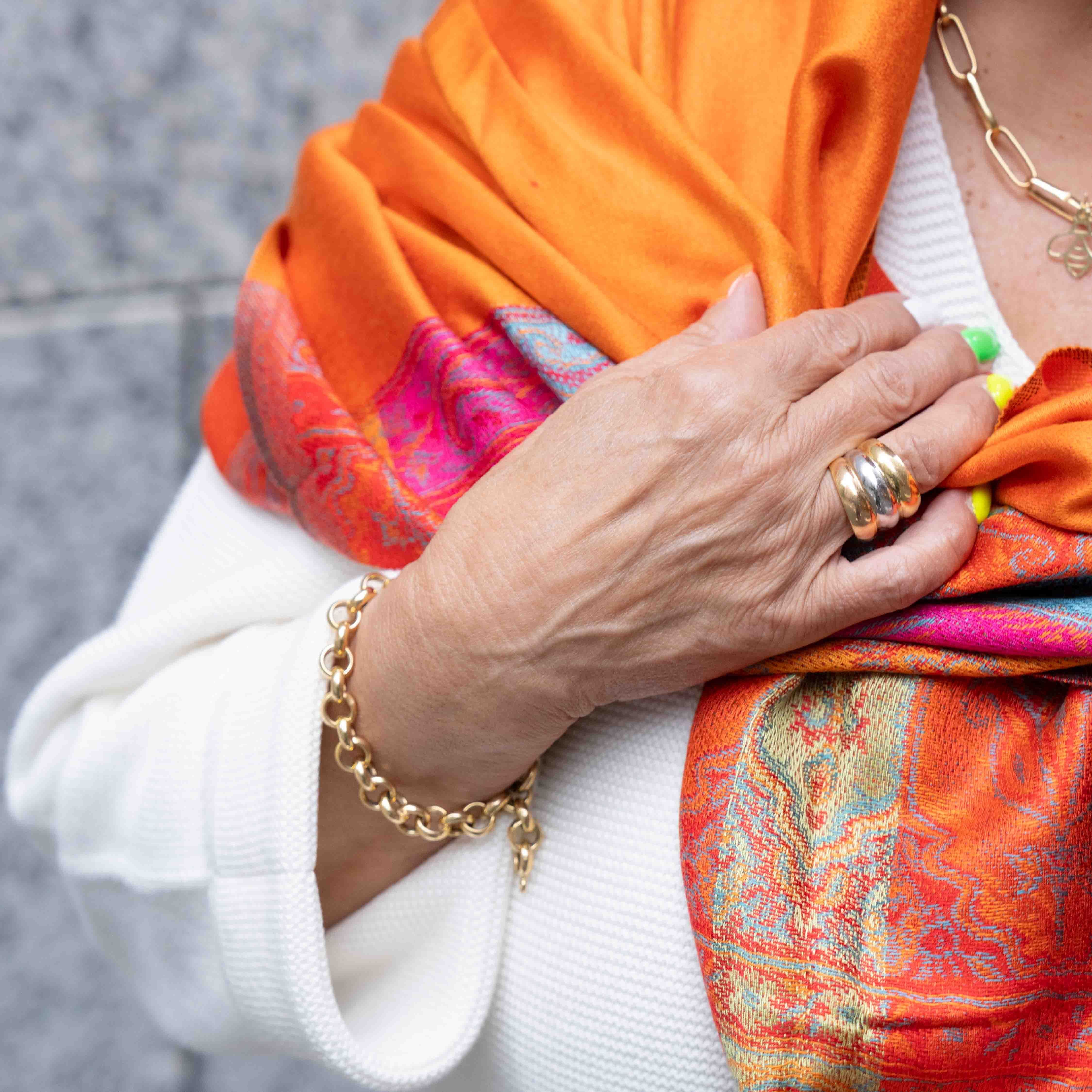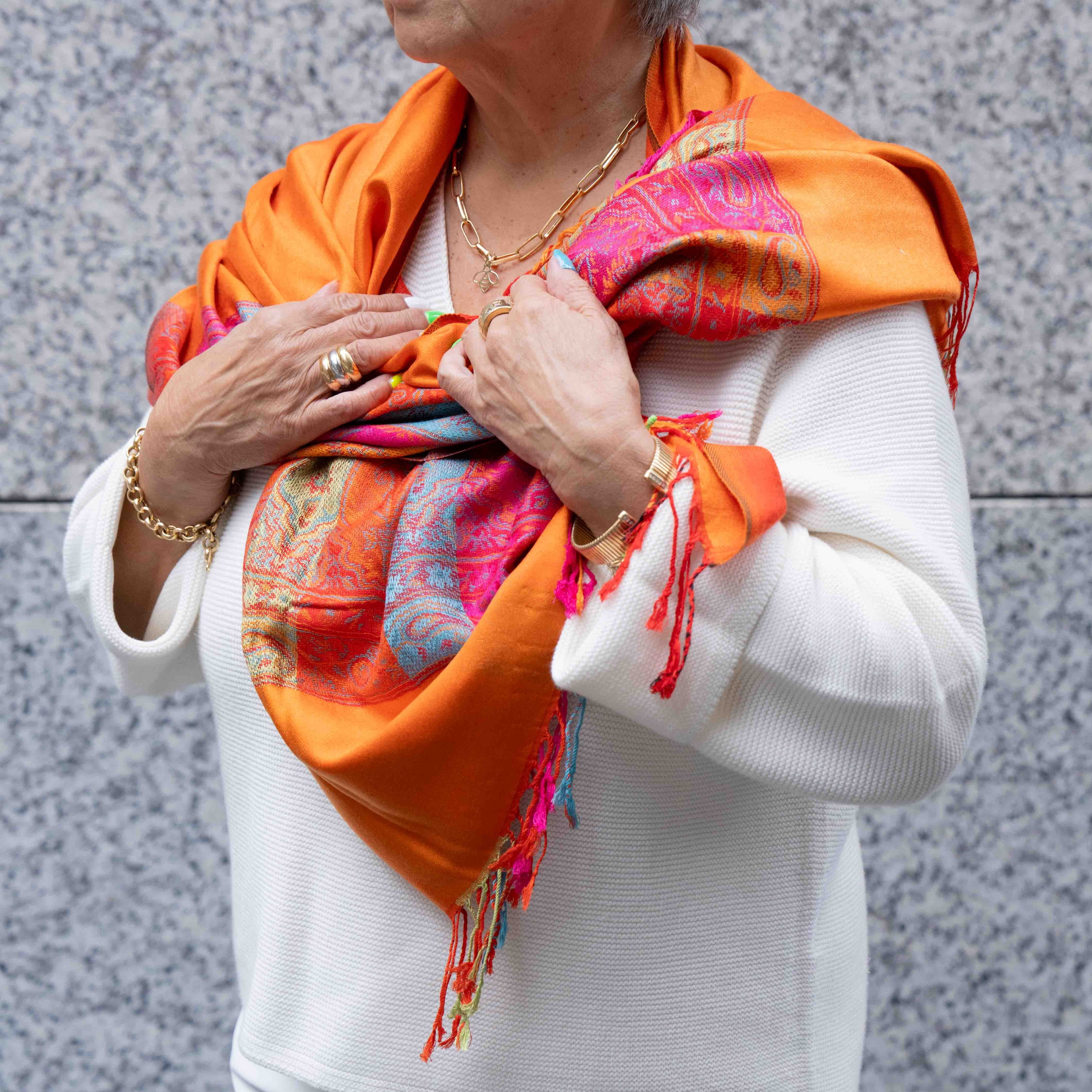 鮮やかなオレンジを基調に、ピンク・ターコイズ・ゴールド・グレーなど多色を組み合わせたマルチカラーストールです。端には繊細なペイズリー柄を織り込み、巻き方によって多彩な表情が生まれる華やかな一枚。大判サイズでショールのように羽織ることもでき、装いのアクセントとして季節を問わず活躍します。